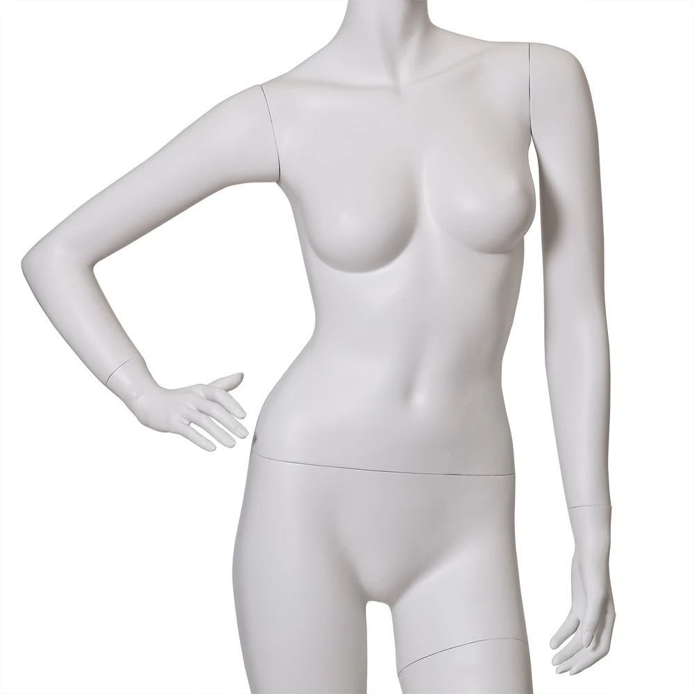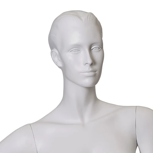 White Matt mannequin for sale with right arm on hip pose. Ideal for stores and shop window displays. These female mannequins have sculptured hair